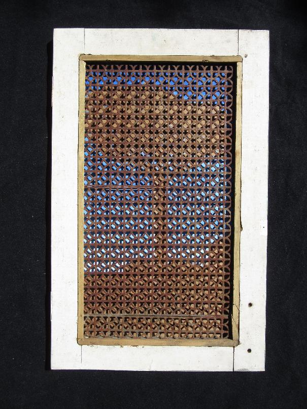 Gesso primer & acrylic paint on plywood behind metal & wood safe door. 460 x 720 mm